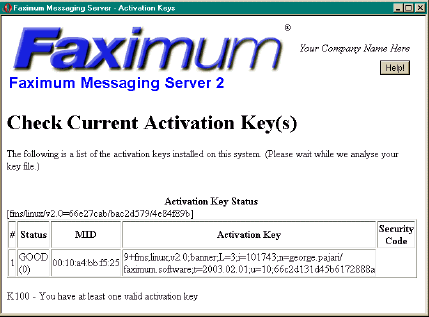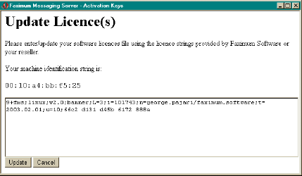 This page is sufficiently long it has been divided into two in order to fit the limitations of the printed version of the manual. The first half, shown above, displays the current software activation keys that have been loaded into you system (along with an indication of whether or not they are valid and have been correctly entered). the second half, shown below, enables you to add additional licences you may have received from Faximum Software but copying from the email message containing the new key and pasting into the window below.