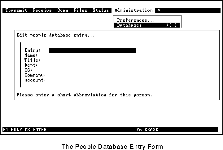 After you press ESC, a blank form appears, allowing you to enter the information on the new entry (Figure 84). Once the information is complete, press F2 to add the entry to the database.